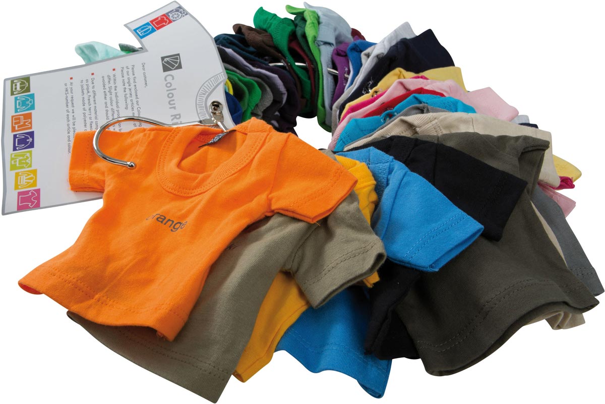 Metallring mit allen Farben von JN01 T-Shirt, Mini T-Shirt mit den Farbnamen als Transferdruck, T-Shirts können ganz einfach vom Ring genommen werden, ideal für Veranstaltungen, Showrooms und Prästentationen
