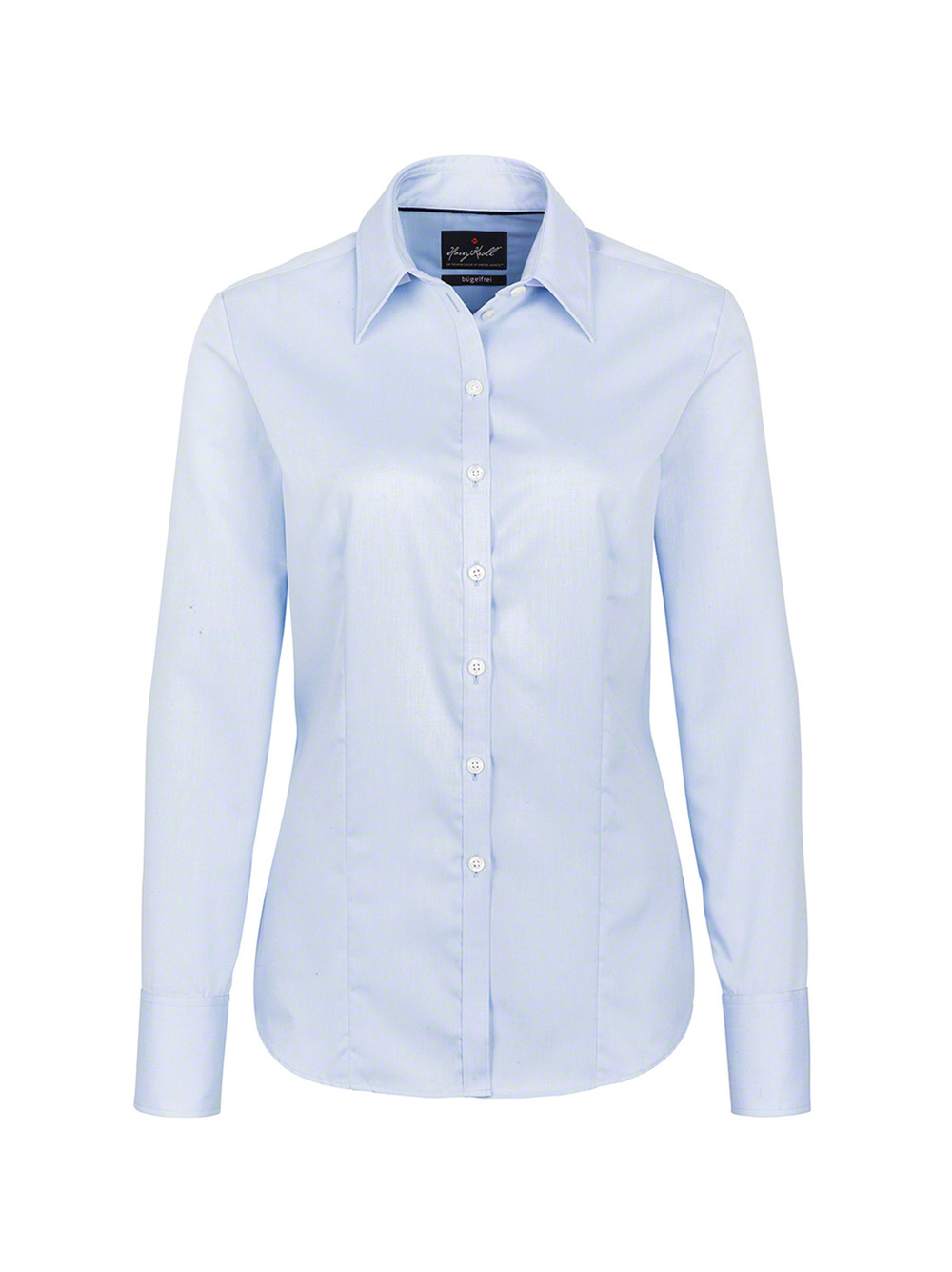 Business-Bluse, klassisch langärmelig aus bügelfrei ausgerüstetem Baumwollgewebe mit angenehm weichem Griff, formstabil und strapazierfähig. Modische Paspel aus dunkelblauem Satin an der inneren Kragennaht, klassische Frontleistenverarbeitung, Rückenteil mit Schulterpasse, 4-Loch-Knöpfe - über Kreuz vernäht und doppelt verknotet für extrafesten Halt - und Ersatzknöpfe. Gewebtes Harry Kroll®-Necklabel aus hochwertigem Kettsatin mit ultraschallgeschnittenen Bandkanten für angenehmen Tragekomfort.