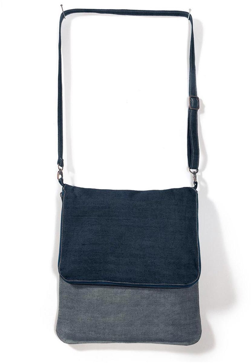 flap zip closure, crossbody bag: long shoulder handle in denim, metal zip in antique brass, two colour shades: deep blue denim side and reverse denim side
