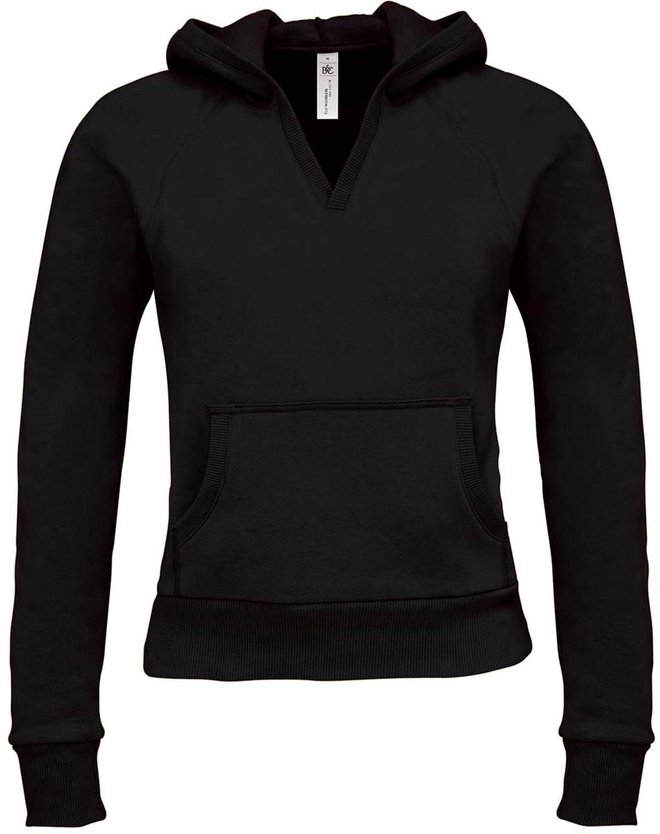 feminine fitted cut, V-neck hooded sweat, french terry, hood and kangaroo pockets finished with 2x2 rib, collar, cuffs and hem in 2x2 rib, raglan sleeved with trendy rough seems