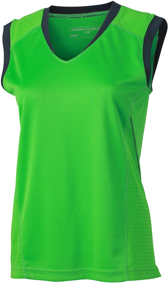 lightly waisted, V-neck, contrasting insets and flatlock seams, moisture-adjusting, quick-drying, reflective transfer at the back