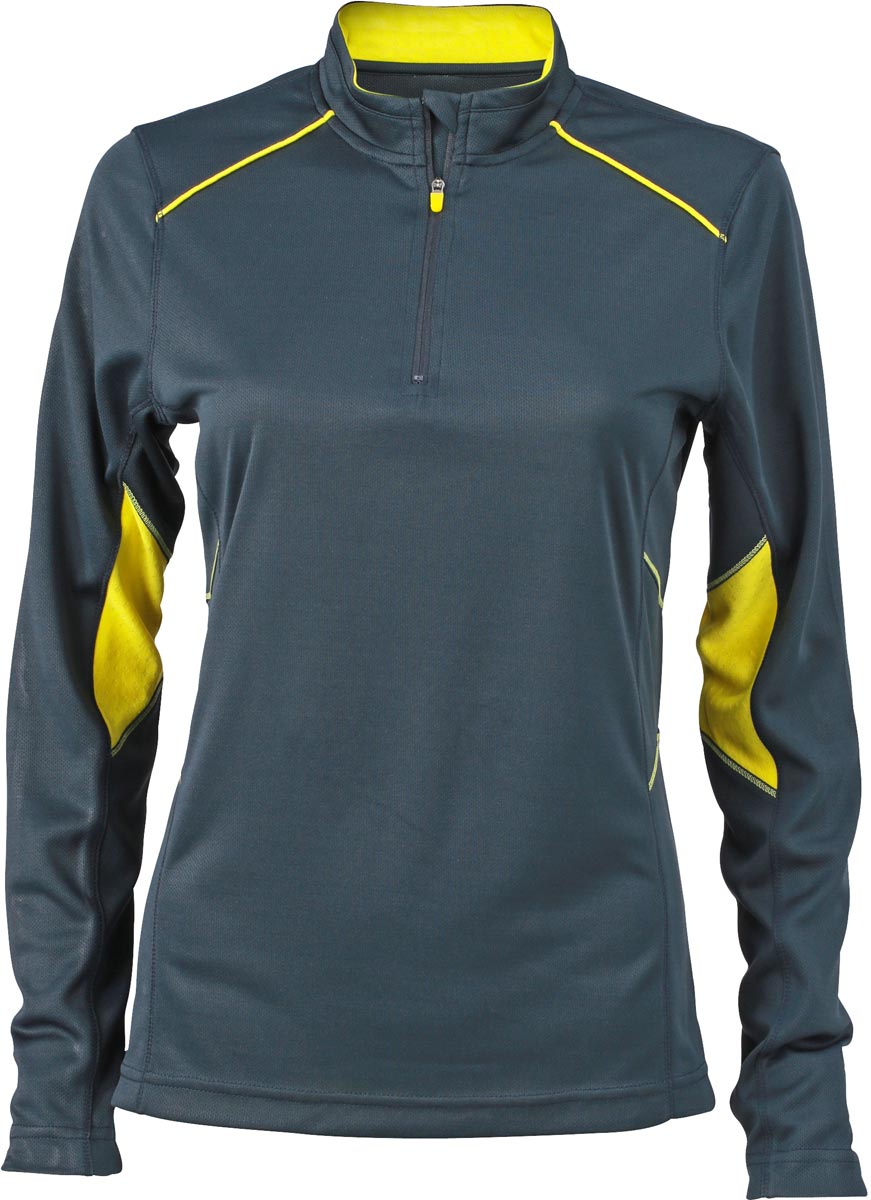 Lightly waisted, contrasting insets and flatlock seams, zipped stand-up collar, moisture-adjusting, quick-drying, reflective transfer at the back