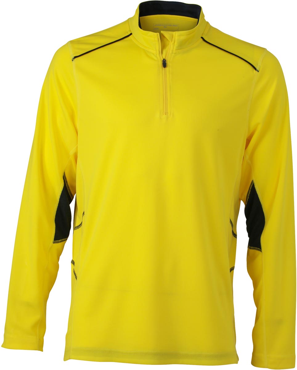 Contrasting insets and flatlock seams, zipped stand-up collar, moisture-adjusting, quick-drying, reflective transfer at the back